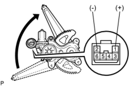 (a) Connect a positive (+) lead of the battery to terminal 1, and a negative (-) lead to terminal 2 of the rear power window regulator motor assembly to move the lift arm to the position shown in the illustration.