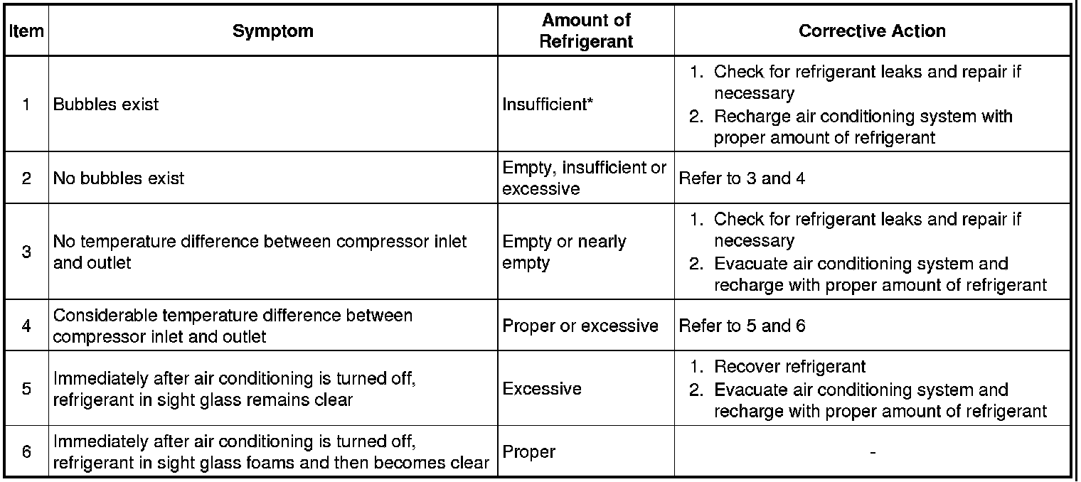 *: Bubbles in the sight glass with the vehicle interior temperature above 35°C (95°F) can be considered normal if cooling is sufficient.