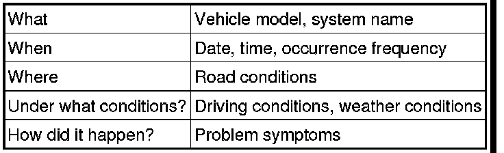 The most difficult case in troubleshooting is when no problem symptoms occur. In such a case, a thorough problem analysis must be carried out. A simulation of the same or similar conditions and environment in which the problem occurred in the customer's vehicle should be carried out. No matter how much skill or experience a technician has, troubleshooting without confirming the problem symptoms will lead to important repairs being overlooked and mistakes or delays.