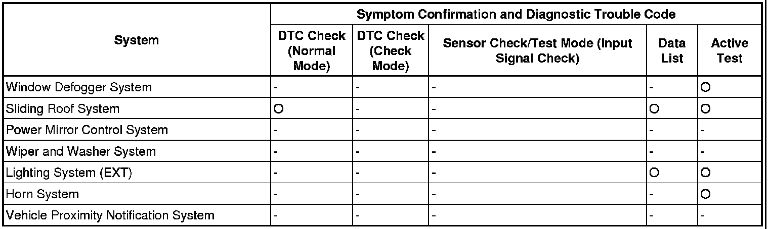 In the symptom simulation test, the problem symptoms as well as the problem area or parts must be confirmed. First, narrow down the possible problem circuits according to the symptoms. Then, connect the tester and carry out the symptom simulation test, judging whether the circuit being tested is defective or normal. Also, confirm the problem symptoms at the same time. Refer to Problem Symptoms Table for each system to narrow down the possible causes.