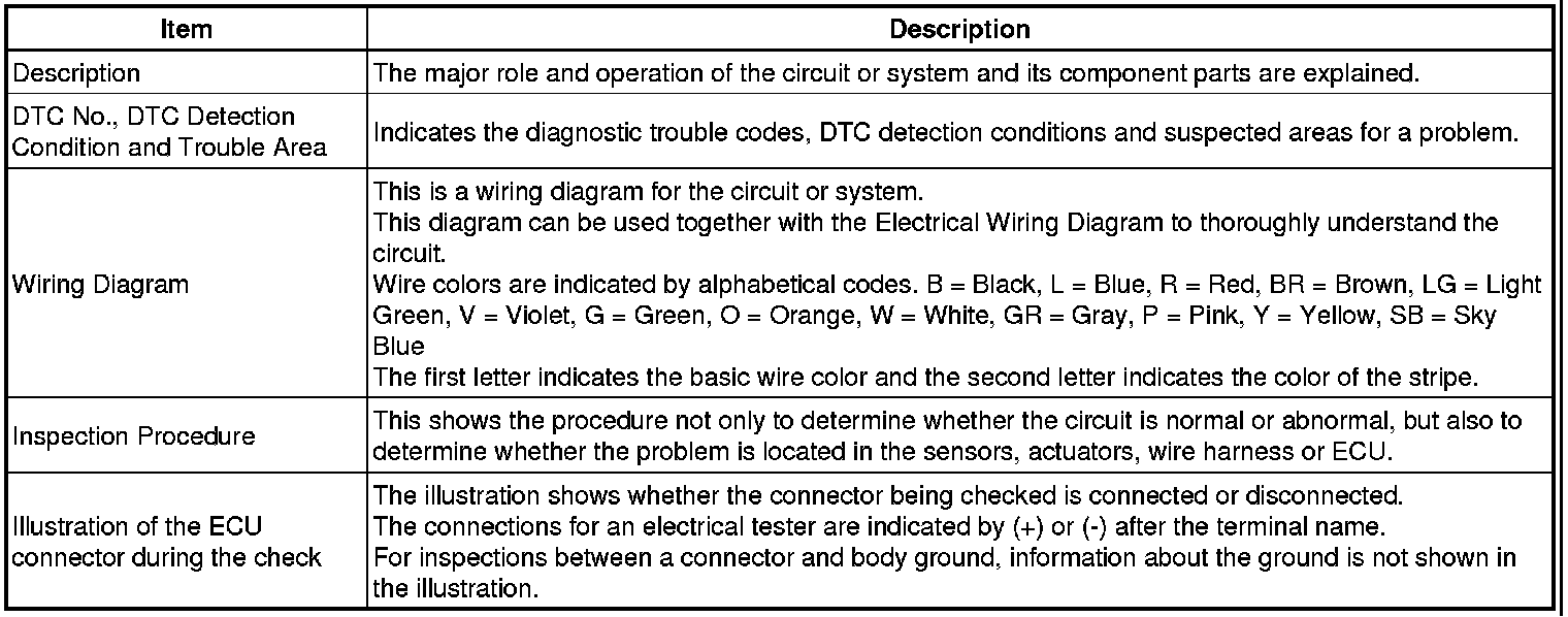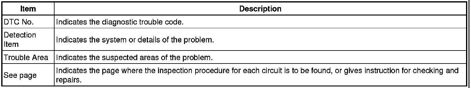 Look for output Diagnostic Trouble Codes (DTCs) (from the DTC checks) in the appropriate section's Diagnostic Trouble Code chart. Use the chart to determine the trouble area and the proper inspection procedure. A description of each of the chart's columns is shown in the table below.