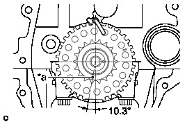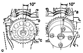 There are 3 marks on the camshaft timing sprocket. Make sure to set the timing mark (rectangle) to 10° as shown in the illustration. Make sure to set the camshaft timing gear assembly to 10° as shown in the illustration. This is the location of the camshafts when the crankshaft is 20° ATDC.