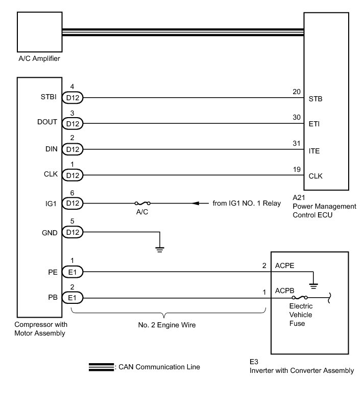 The inverter activation signal is sent to the compressor with motor assembly from the power management control ECU. Compressor control is stopped and the DTC is stored if there is an open or short in the signal circuit.