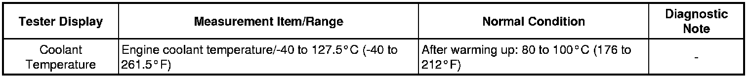 Engine coolant temperature displayed on the Techstream is 80 to 100°C (176 to 212°F) after warming up.