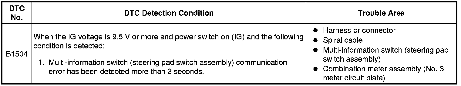 The combination meter assembly (No. 3 meter circuit plate) communicates with the multi-information switch (steering pad switch assembly) via a direct line. If the combination meter assembly (No. 3 meter circuit plate) detects a communication malfunction, it stores this DTC.