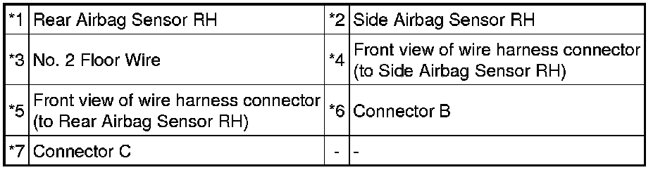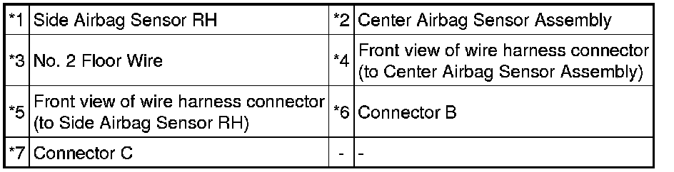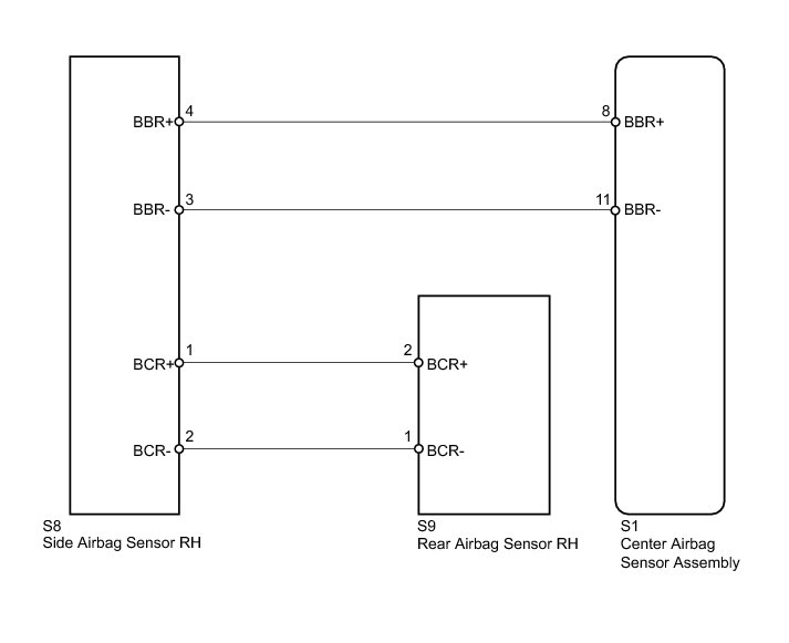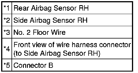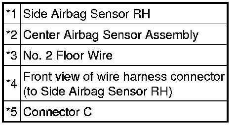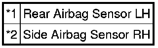 The side collision RH circuit (to determine deployment of the front seat side airbag assembly RH and curtain shield airbag assembly RH) is composed of the center airbag sensor assembly, side airbag sensor RH and rear airbag sensor RH.