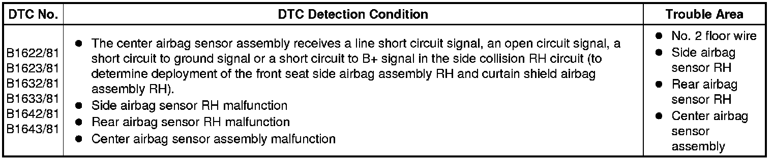 These DTCs are stored when a malfunction is detected for the side collision RH circuit (to determine deployment of the front seat side airbag assembly RH and curtain shield airbag assembly RH).