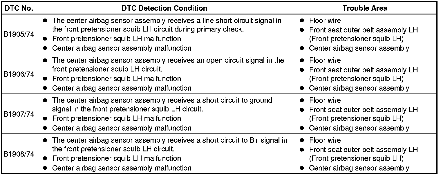 These DTCs are stored when a malfunction is detected in the front pretensioner squib LH circuit.