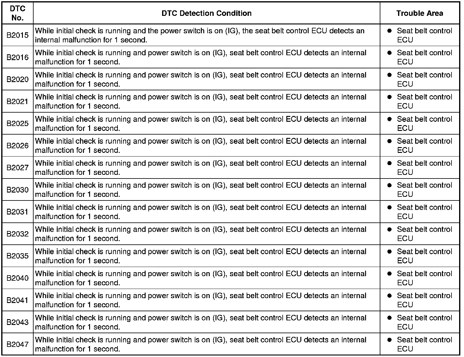The DTCs above are stored during seat belt control ECU self diagnosis.
