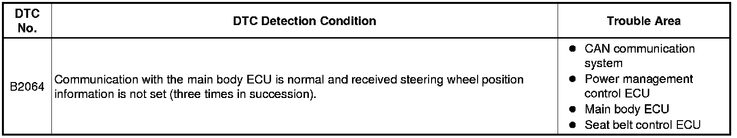 DTC B2064 is stored when the CAN communication frame with the main body ECU is normal and communication is available, but the steering wheel position information is not set or varies.