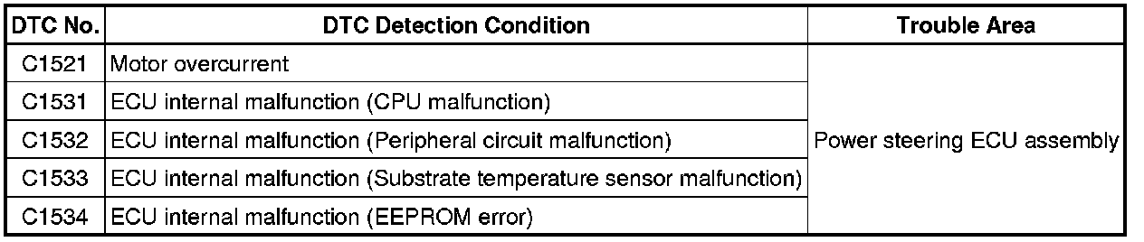 If the power steering ECU assembly detects these DTCs, it will shut off the motor relay circuit (built into the power steering ECU assembly) and stop power assist. However, power assist continues if DTC C1533 or C1534 is output.