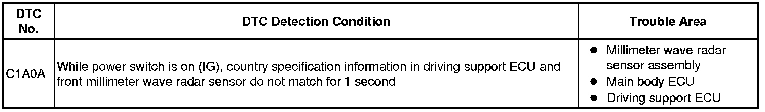 When the millimeter wave radar sensor assembly is replaced with a new one, it acquires the country specification information from the driving support ECU. Also, when the driving support ECU is replaced with a new one, it receives the country specification information from the main body ECU. When the country specification information in the sensor and ECU do not match, DTC C1A0A is output.