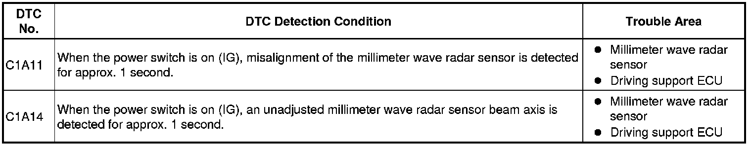 After installing a new millimeter wave radar sensor, if the sensor beam axis adjustment is not performed, DTC C1A14 is stored.
