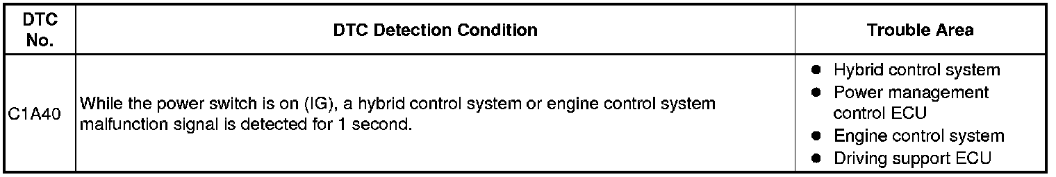When the driving support ECU receives a hybrid control system or engine control system malfunctioning signal from the power management control ECU via the CAN communication system, DTC C1A40 is stored.