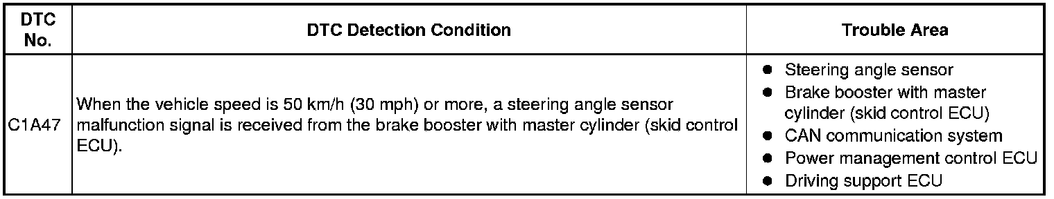 If the brake booster with master cylinder (skid control ECU) detects a malfunction of the steering angle sensor, it sends a malfunction signal to the driving support ECU and records a DTC.