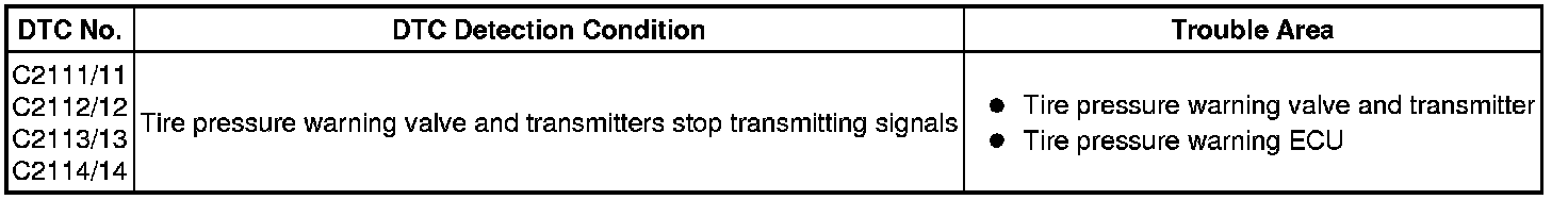The tire pressure warning valve and transmitters that are installed in the tire and wheel assemblies measure the tire pressures. The measured values are transmitted to the tire pressure warning antenna and receiver on the body as radio waves and then sent to the tire pressure warning ECU. The ECU compares the measured air pressure values with the air pressure threshold. When the measured air pressure value is less than this threshold, the warning light in the combination meter comes on. The tire pressure warning ECU stores a DTC when the tire pressure warning valve and transmitter stops transmitting signals. At this time, forcibly transmit the signals by releasing the tire pressure rapidly. The stored DTC is cleared when the signal transmission is resumed.