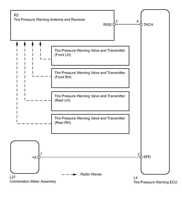 The tire pressure warning ECU receives a vehicle speed signal from the combination meter assembly and a RSSI signal from the tire pressure warning antenna and receiver. The tire pressure warning ECU uses these signals to detect DTCs C2121/21 to C2124/24 (No Signal from Transmitter) and DTC C2177/77 (Initialization not Completed).