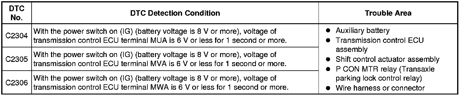 * If DTC C2304, 2305 or 2306 is stored individually, there may be a malfunction in the parking lock motor (MUA, MVA or MWA signal) circuits.