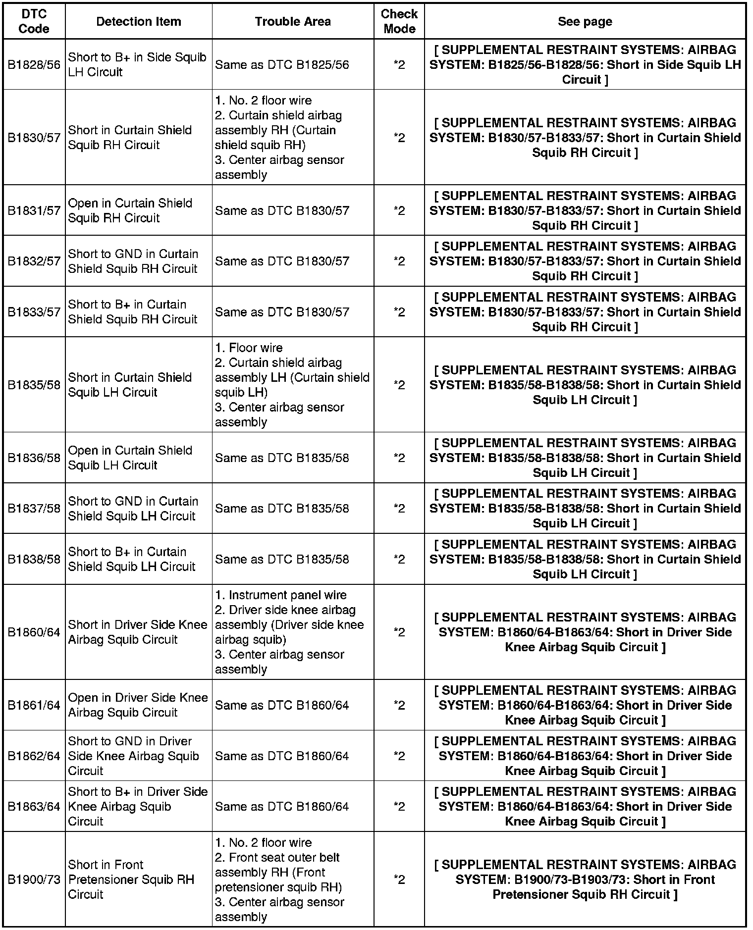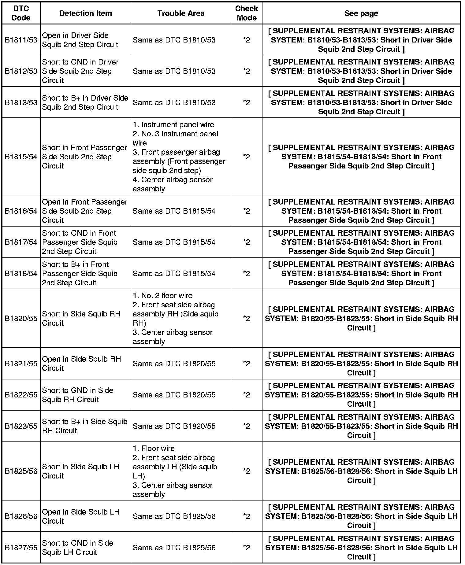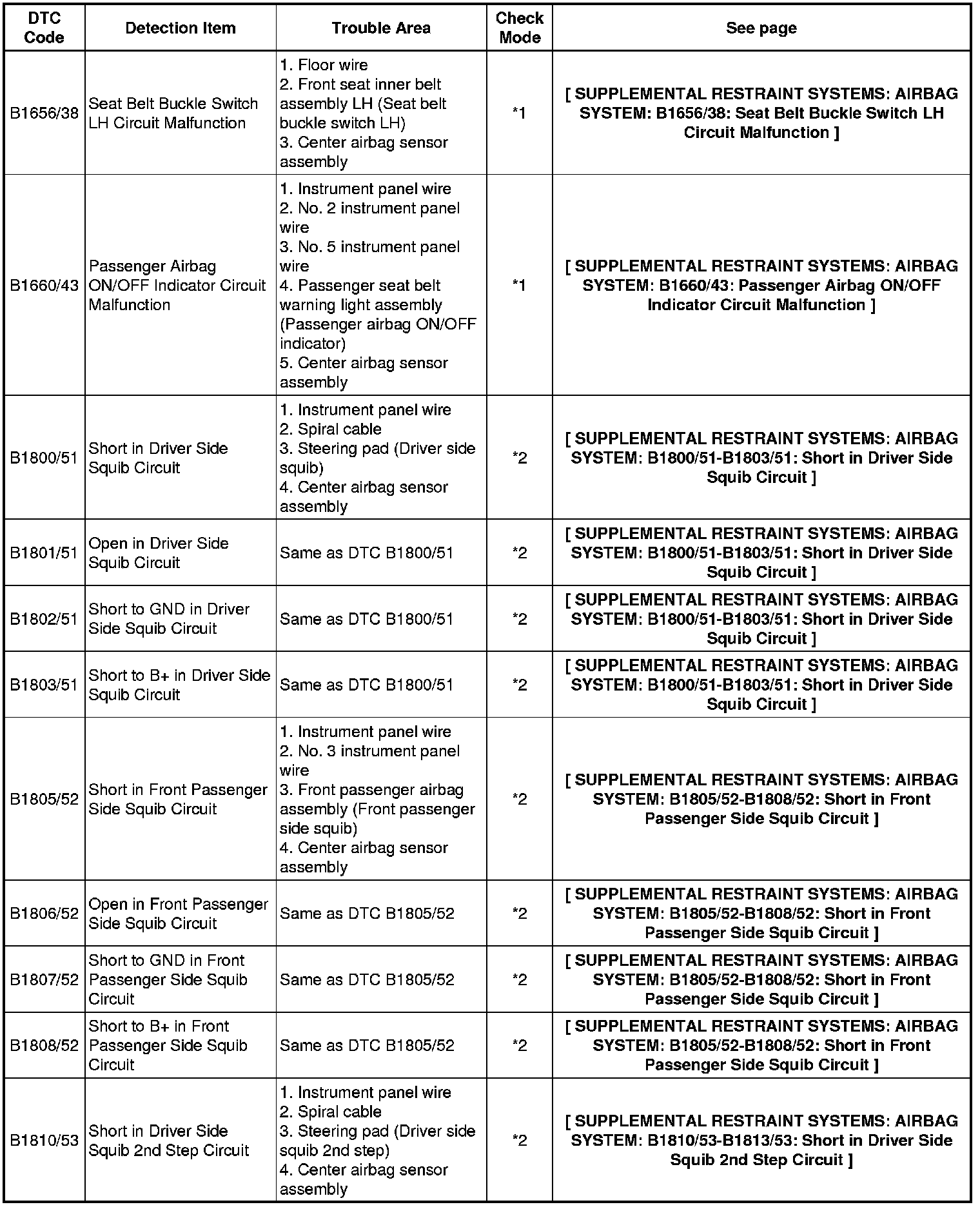 * In the case of any malfunction concerning an open circuit, short to ground, or short to B+ due to a squib, other trouble codes may not be detected. In this case, repair the malfunction currently indicated and then perform malfunction diagnosis again.