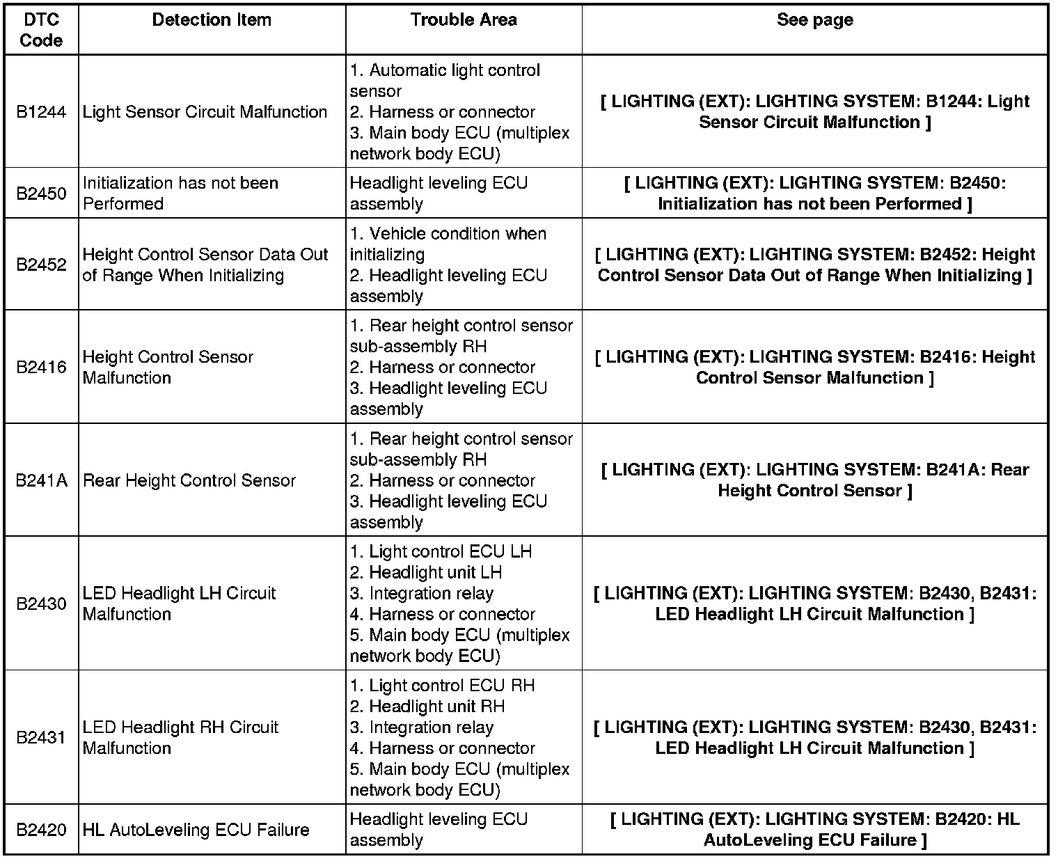 LIGHTING (EXT): LIGHTING SYSTEM: DIAGNOSTIC TROUBLE CODE CHART