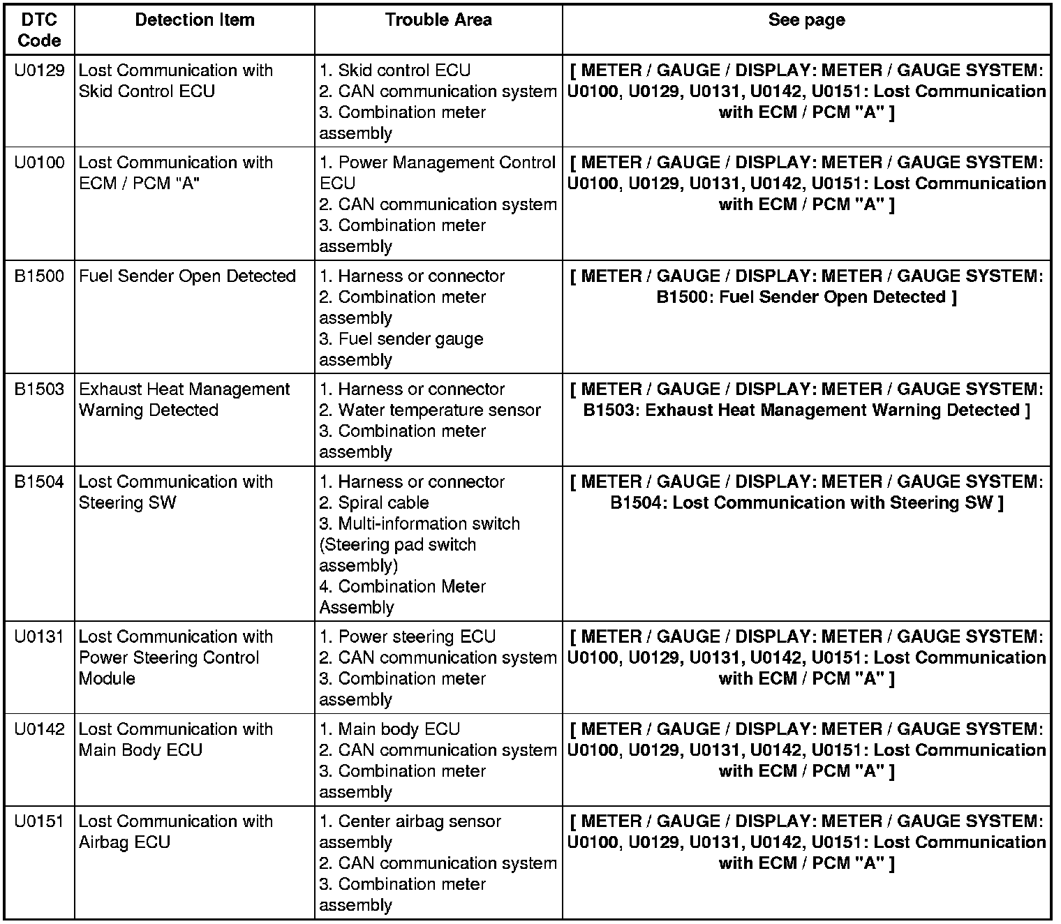 METER / GAUGE / DISPLAY: METER / GAUGE SYSTEM: DIAGNOSTIC TROUBLE CODE CHART