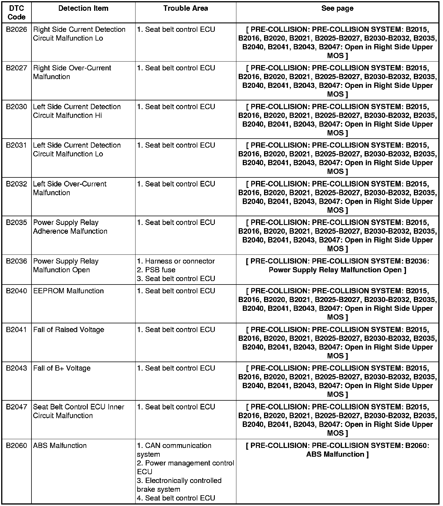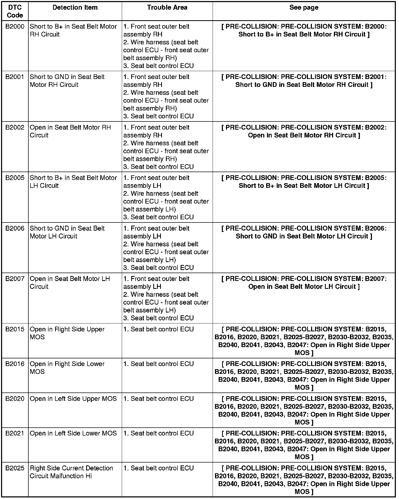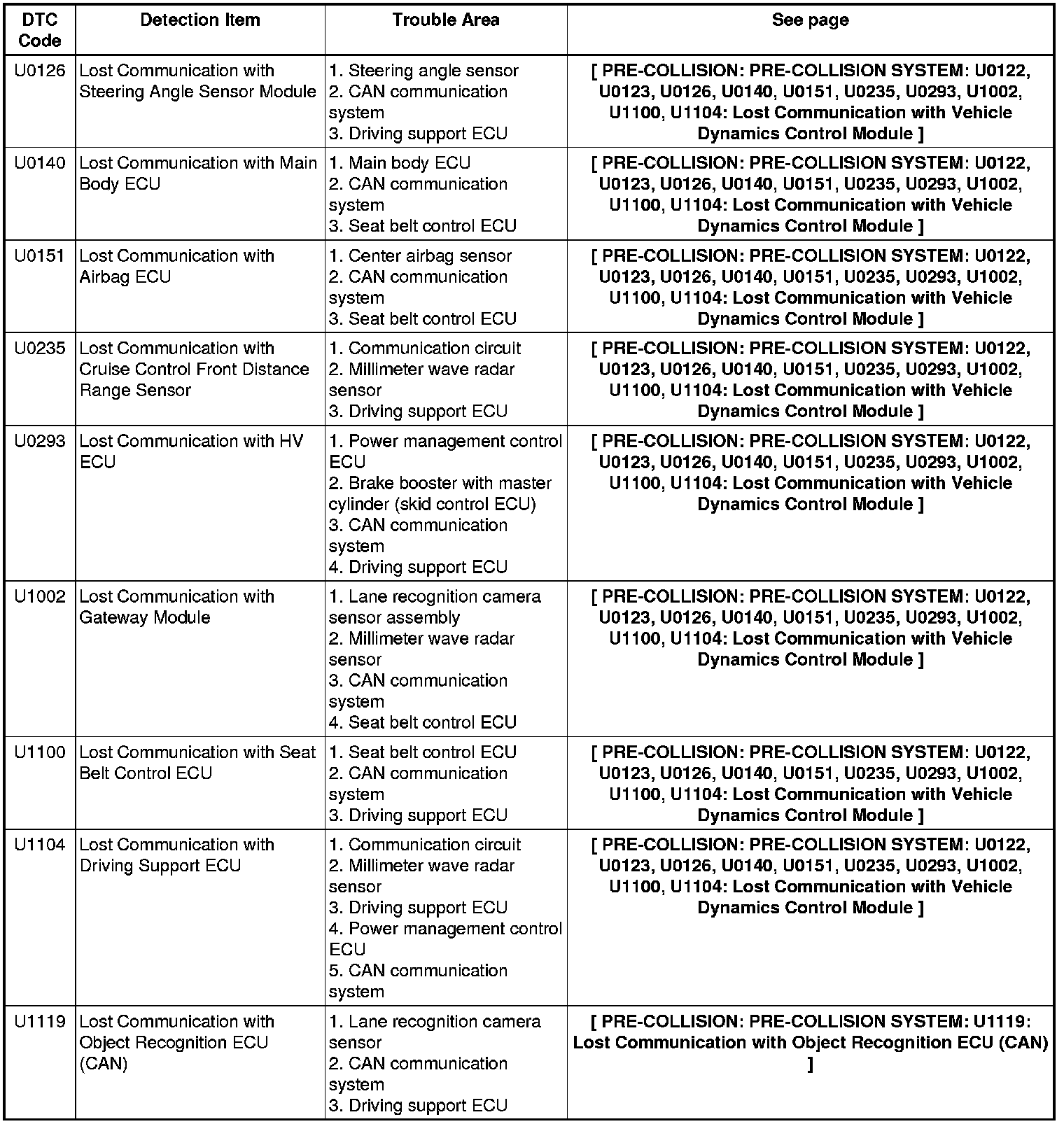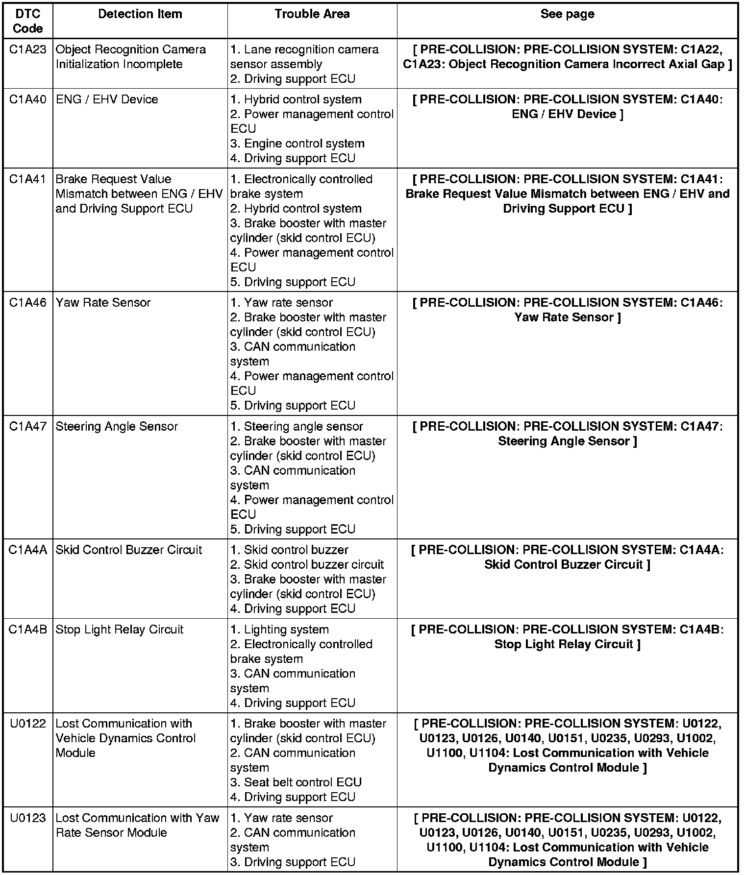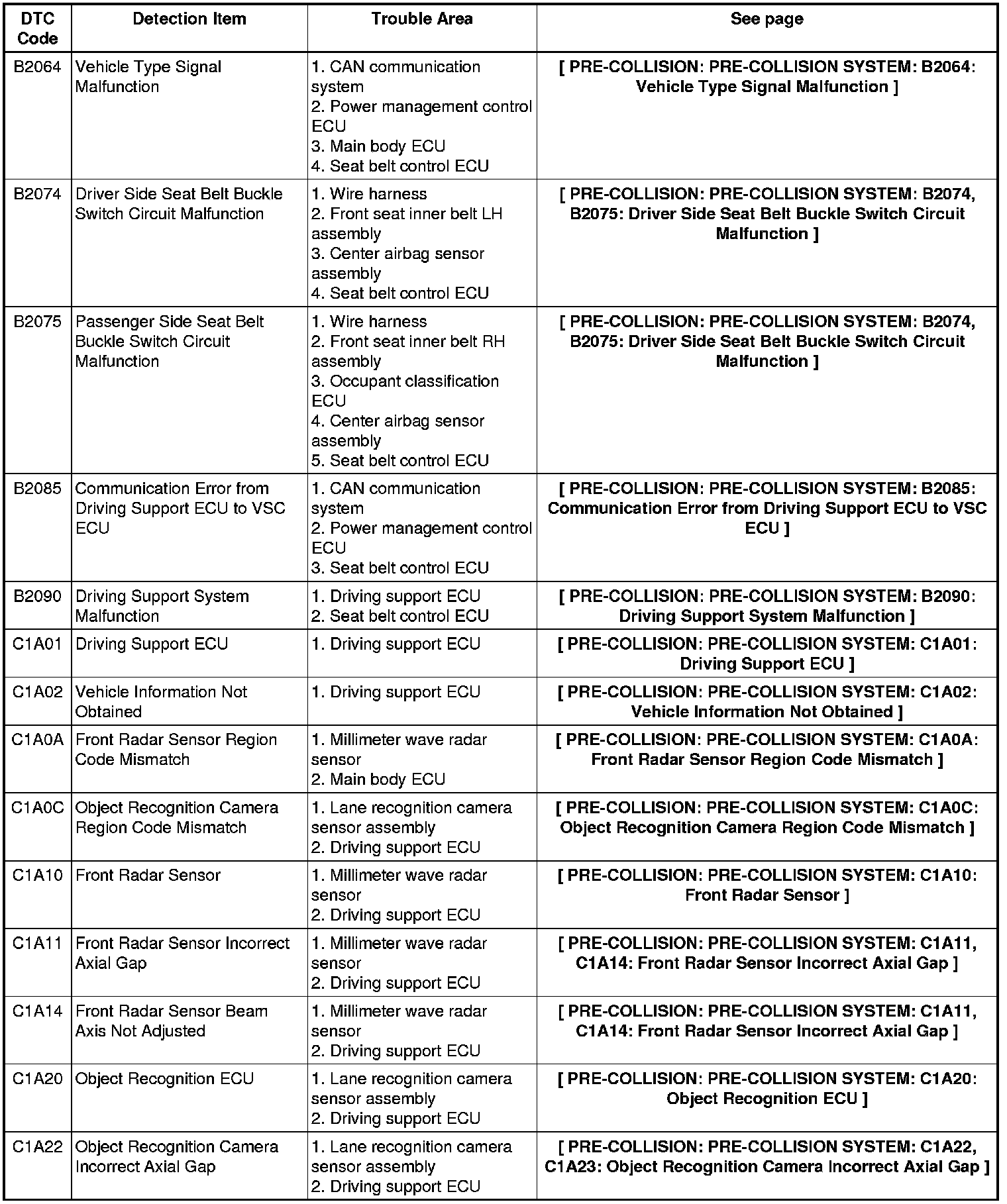 PRE-COLLISION: PRE-COLLISION SYSTEM: DIAGNOSTIC TROUBLE CODE CHART