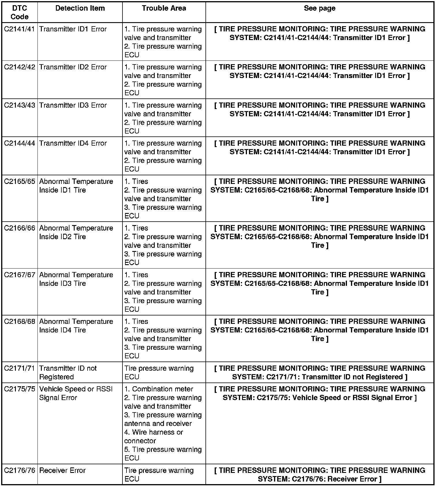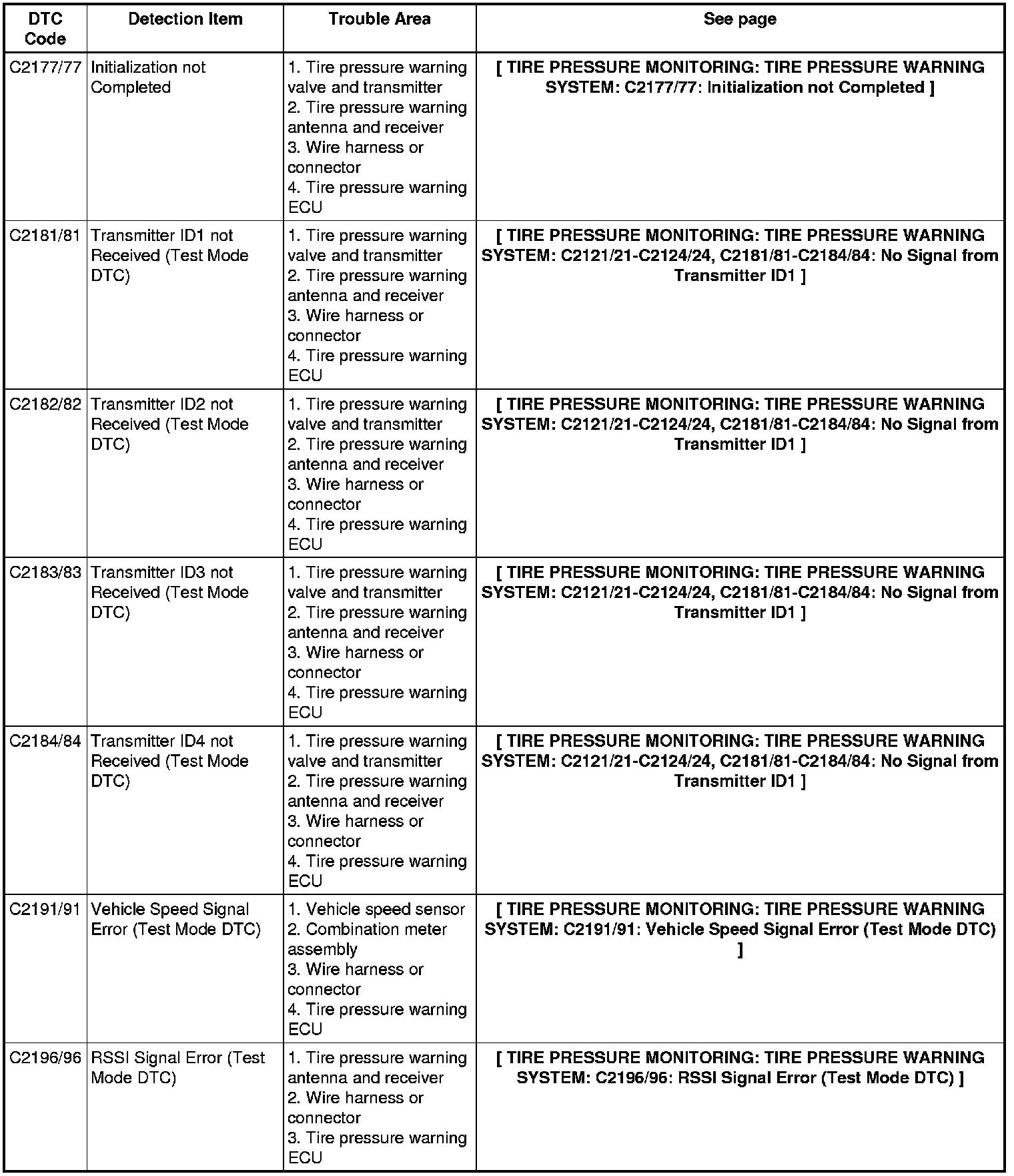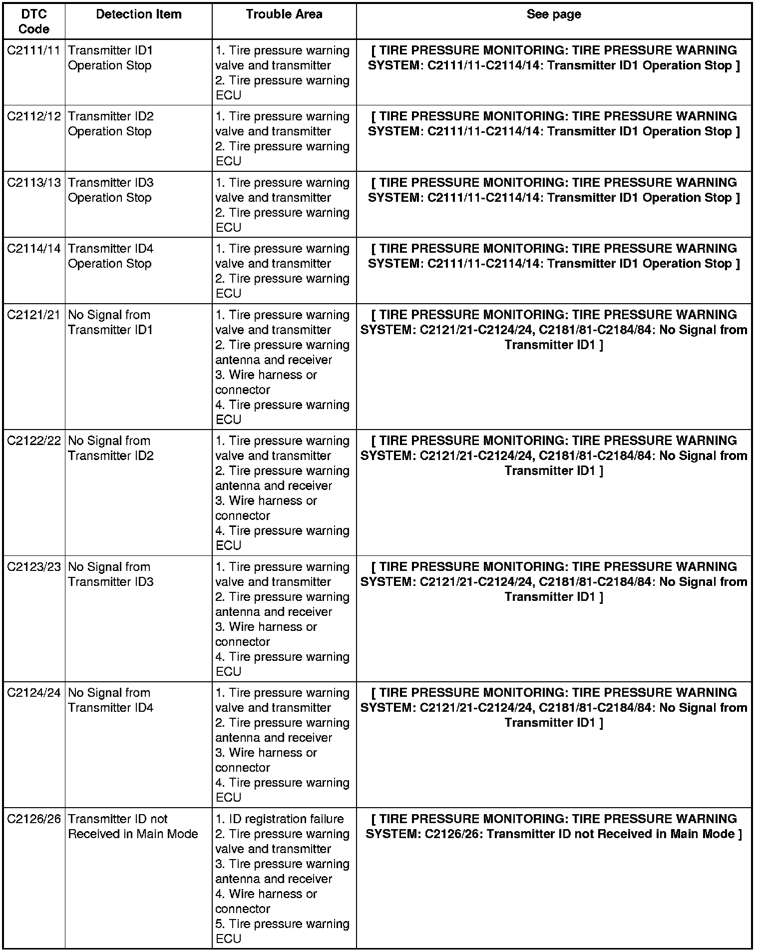 TIRE PRESSURE MONITORING: TIRE PRESSURE WARNING SYSTEM: DIAGNOSTIC TROUBLE CODE CHART