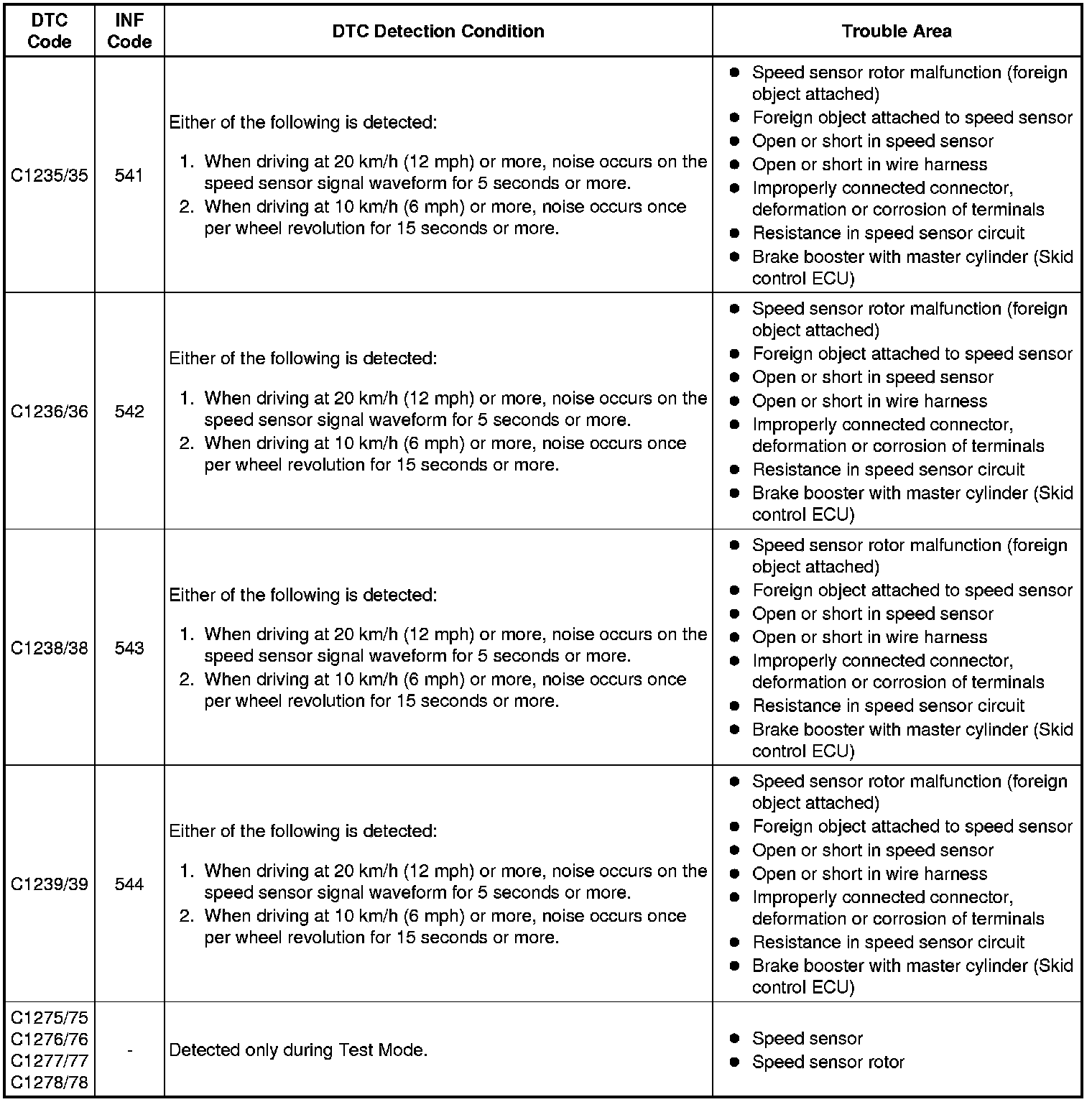 * DTCs C1238/38 and C1277/77 are for the rear speed sensor RH.