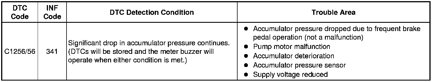 DTC C1256/56 may be output if the accumulator pressure drops due to frequent braking (this is not a malfunction).