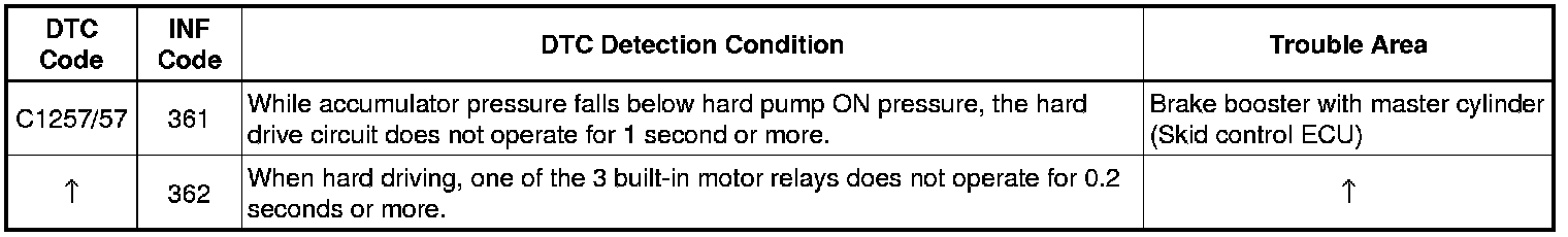 The skid control ECU troubleshoots the built-in motor relay drive circuit, and outputs this DTC when a malfunction is detected.