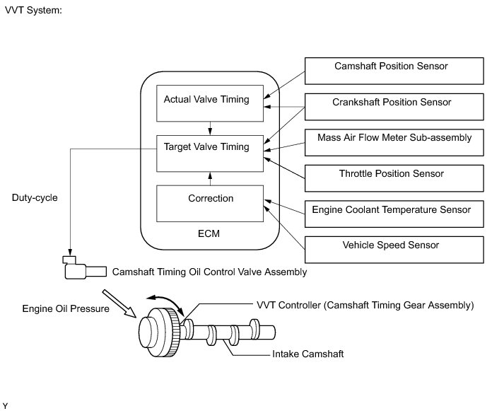 The VVT (variable valve timing) system adjusts the intake valve timing to improve driveability. The engine oil pressure turns the VVT controller to adjust the valve timing.