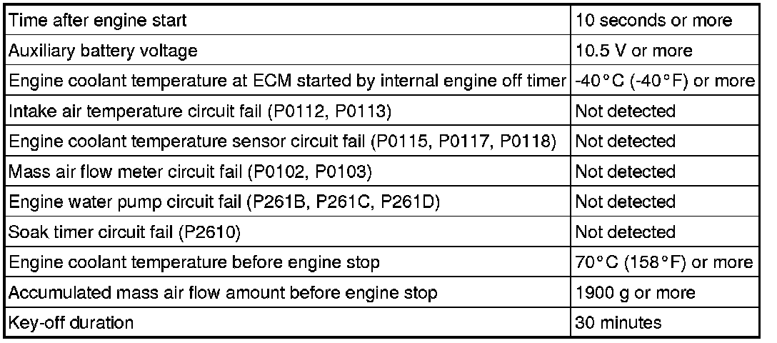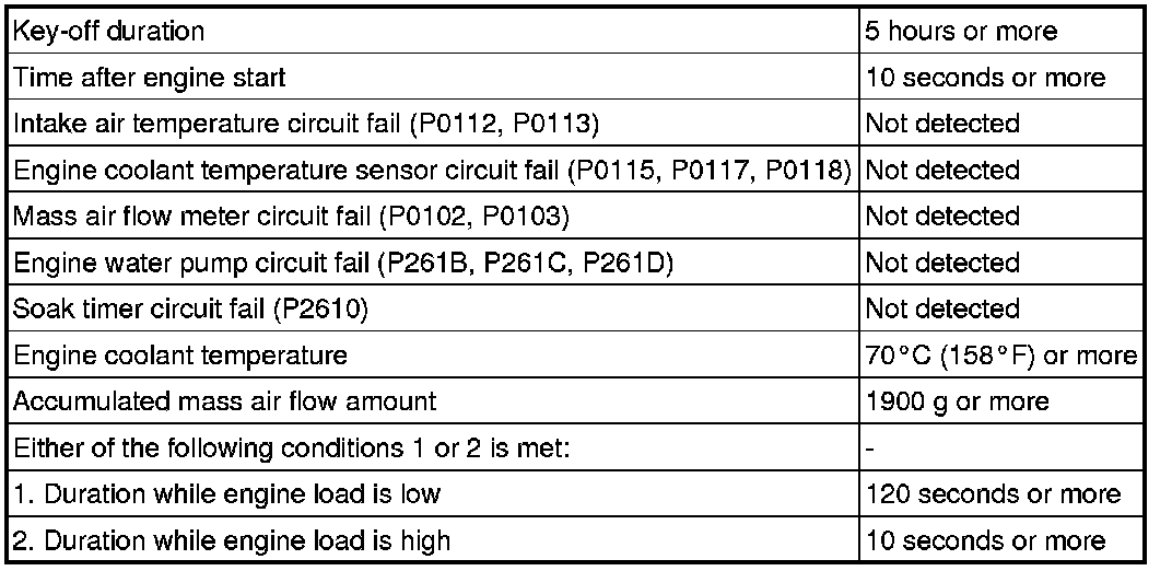 The monitor runs when the engine is started cold after 5 hours or more have elapsed since the engine stopped. If the intake air temperature sensor output variation until the engine has warmed up completely is less than the threshold, it is determined that a malfunction has occurred in the intake air temperature sensor. When this is detected in 2 consecutive driving cycles, the MIL is illuminated and the DTC is stored.