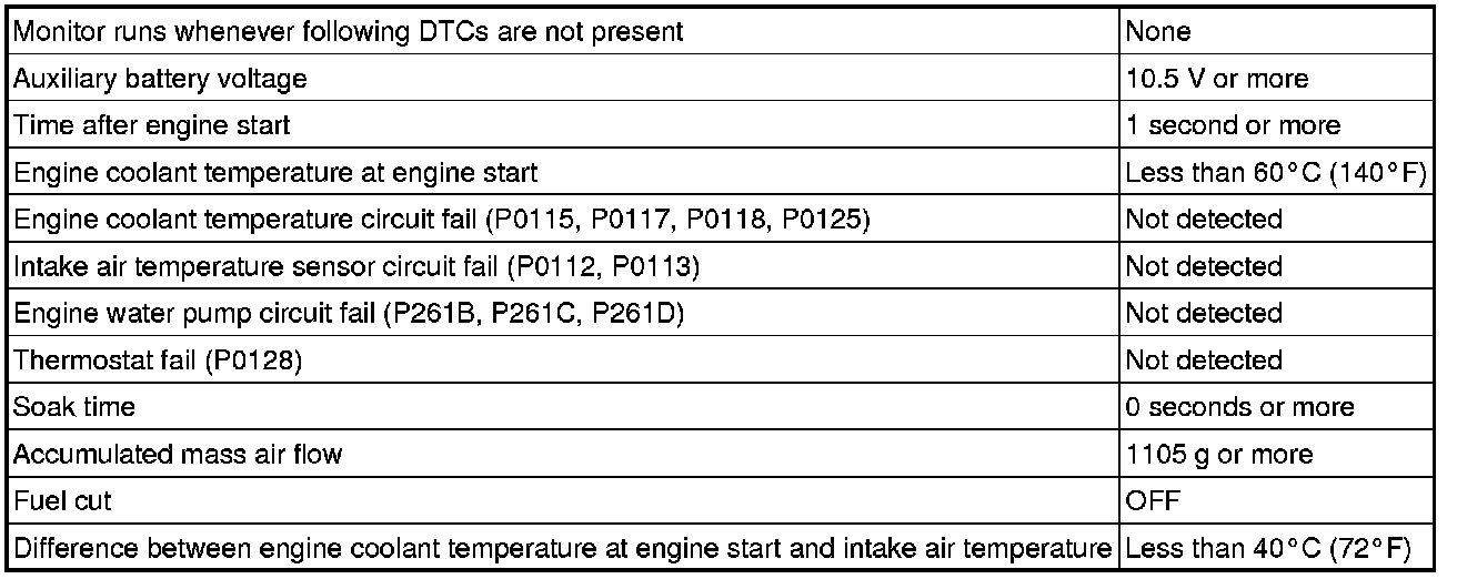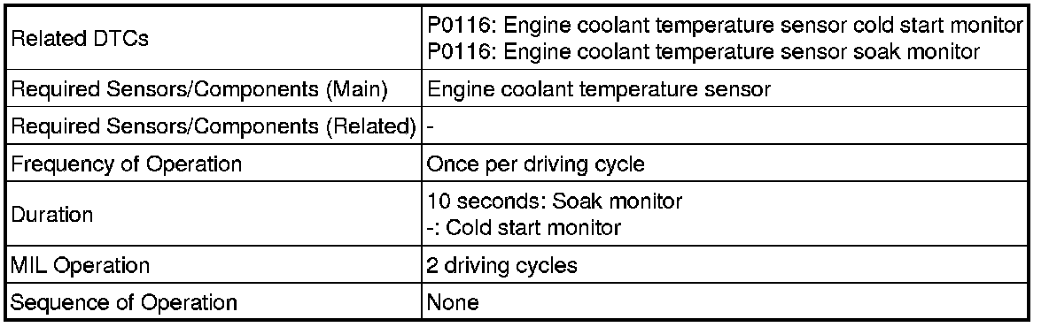 The monitor runs when the engine is started cold. If the change in engine coolant temperature sensor output until the engine is warmed up completely is less than the threshold, it is determined that a malfunction has occurred in the engine coolant temperature sensor. When this is detected in 2 consecutive driving cycles, the MIL is illuminated and the DTC is stored.