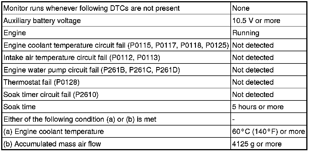 If after driving for 250 seconds, the engine coolant temperature remains within 3°C (5.4°F) of the starting temperature, the DTC is stored (2 trip detection logic).