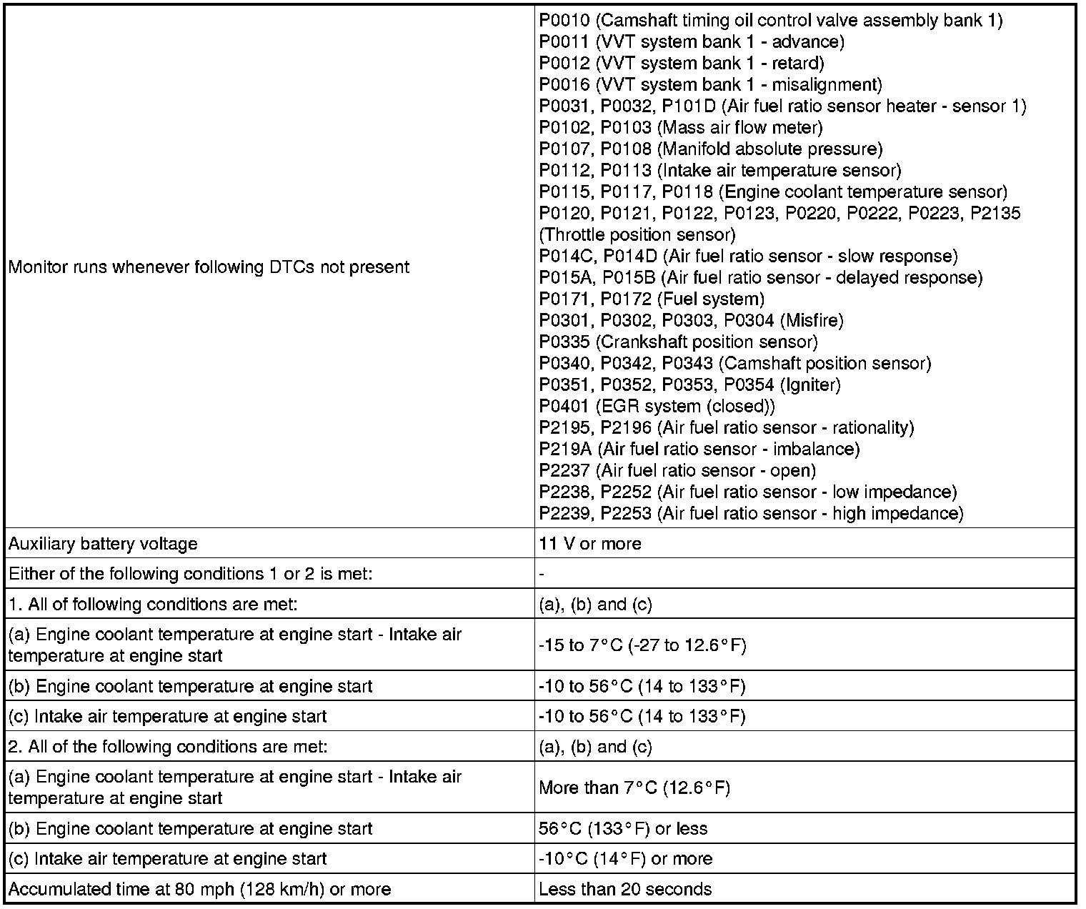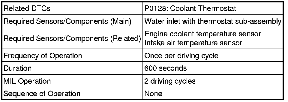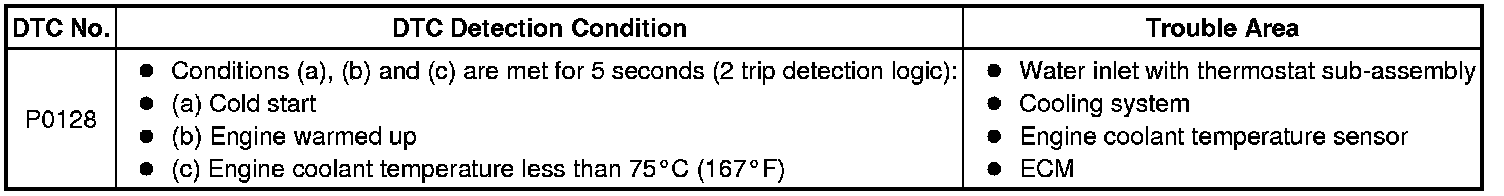 This DTC is stored when the engine coolant temperature does not reach 75°C (167°F) despite sufficient engine warm-up time having elapsed.