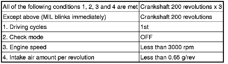 - An excessive number of misfires (approximately 20 to 50 misfires per 1000 crankshaft revolutions) occurs a total of 4 times.