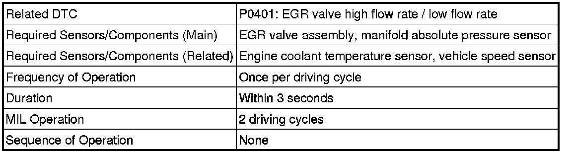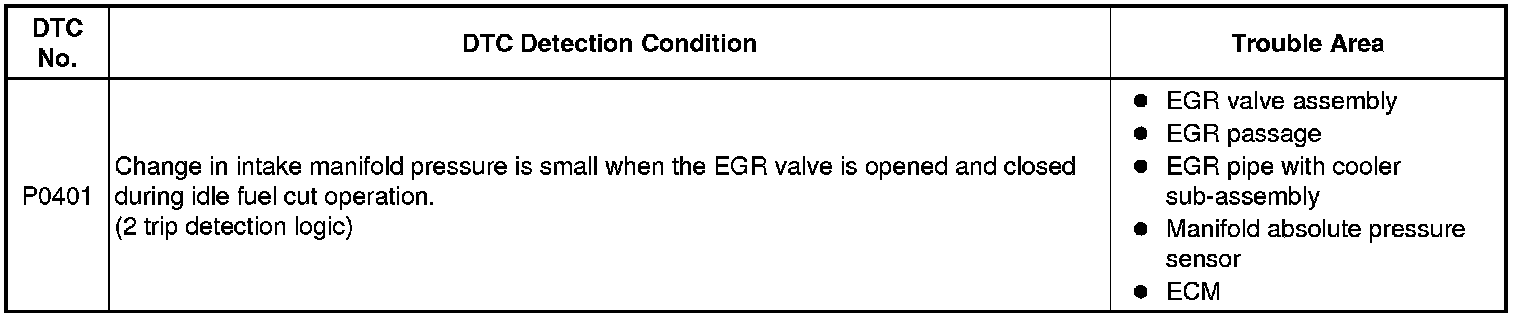 The ECM monitors the pressure inside the intake manifold while opening and closing the EGR valve during fuel cut operation. If there is no change in the manifold absolute pressure sensor value, the ECM interprets this as a malfunction in the EGR valve assembly, illuminates the MIL and stores the DTC (2 trip detection logic).