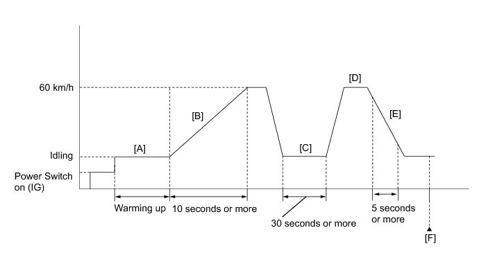 8. Accelerate the vehicle to 60 km/h (37 mph) or more by depressing the accelerator pedal for at least 10 seconds [B].