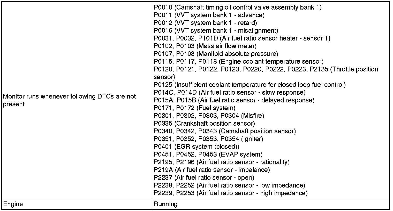 - After driving at a vehicle speed of 6.25 mph (10 km/h) or more, the difference between the target and actual engine idling speed exceeds the threshold 5 times or more during a driving cycle, and then the system determines that the idle speed control flow rate learned value is stuck at the upper or lower limit, or that the IAC flow rate learned value has been changed by an amount that exceeds the threshold.