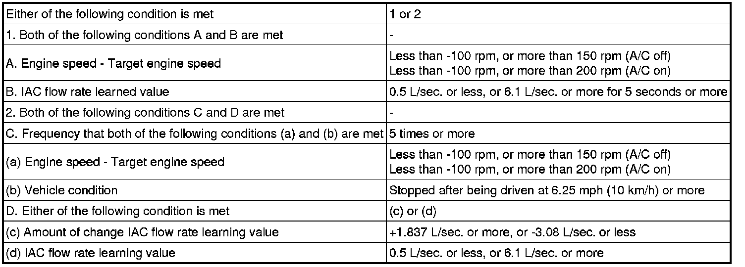 - The difference between the target engine idling speed and actual engine idling speed exceeds the threshold and the IAC flow rate learned value is stuck at the upper or lower limit for 5 seconds or more.