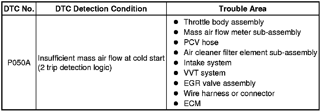 The DTC is designed to monitor the idle air control at cold start. When the engine is started at an engine coolant temperature of lower than 50°C (122°F), the ECM measures the accumulated mass air flow at idle. If it does not reach the specified level within 10 seconds, the ECM interprets this as a malfunction. The MIL is illuminated and a DTC is set when the malfunction is detected in consecutive driving cycles (2 trip detection logic).