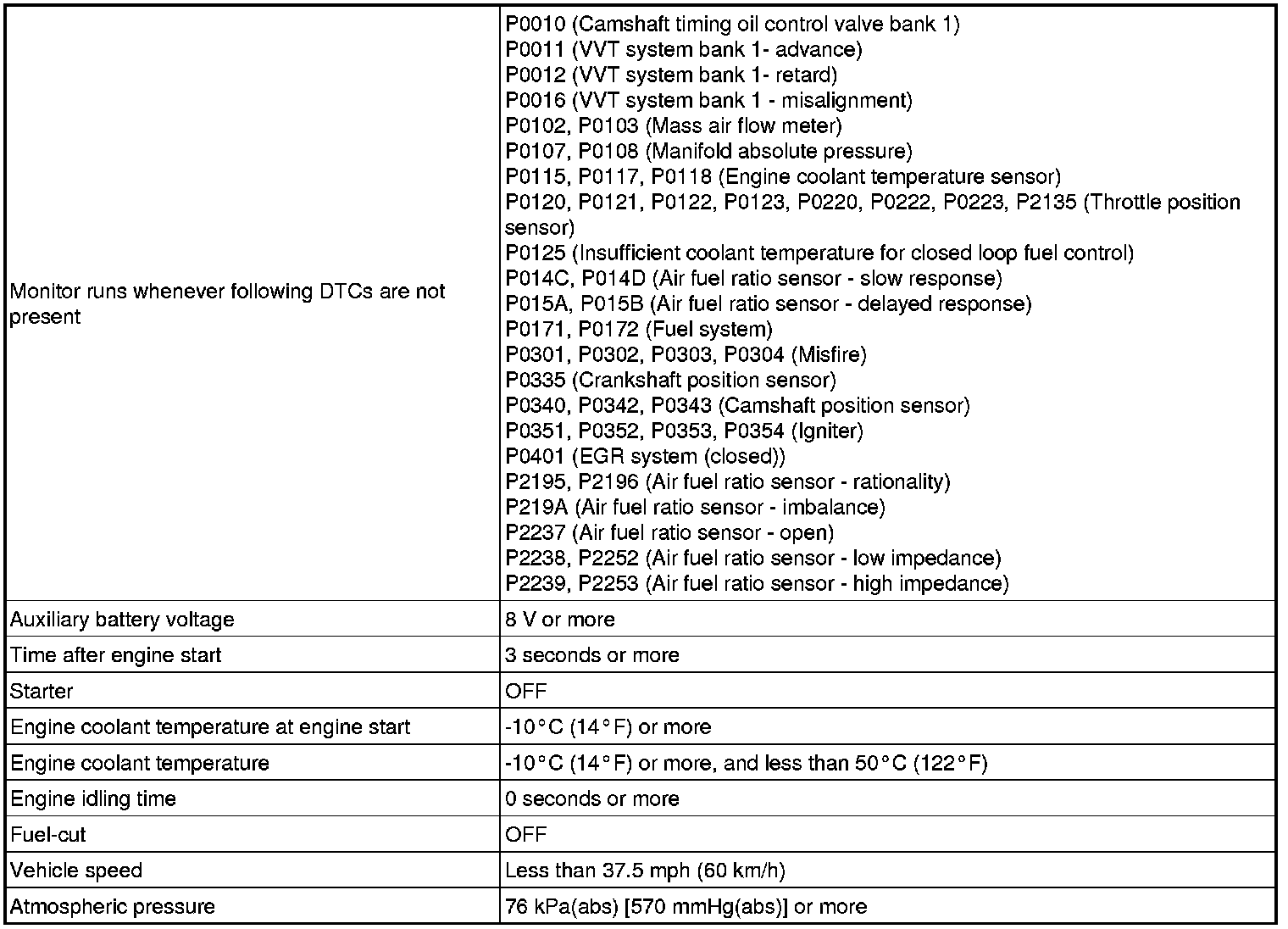 This monitor will run when the engine is started at an engine coolant temperature of -10 to 50°C (14 to 122°F). The DTC can be set after the engine idles for 13 seconds (2 trip detection logic).