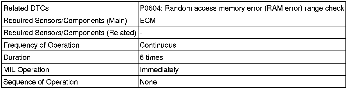 The ECM continuously monitors its internal memory status. This self-check ensures that the ECM is functioning properly. It is diagnosed by internal "mirroring" of the main CPU and sub CPU to detect Random Access Memory (RAM) errors. If outputs from these CPUs are different and deviate from the standard, the ECM illuminates the MIL and stores the DTC immediately.