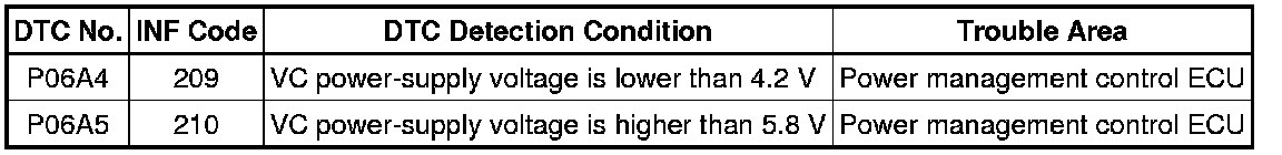 The power management control ECU (HV CPU) monitors voltage of 5 V power supply (VC) used for the sensors. If the power management control ECU (HV CPU) detects a malfunction, it will set a DTC.