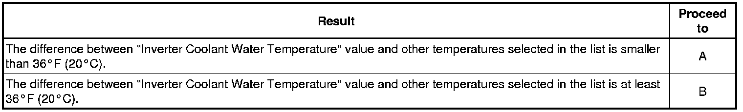 The lower limit temperature that can be displayed for "Inverter Temp (MG1)", "Inverter Temp (MG2)", "Cnv Tmp (Upper)" and "Cnv Temp (Lower)" is 59°F (15°C). The lower limit temperature for "Inverter Coolant Water Temperature" is -58°F (-50°C). The "Inverter Coolant Water Temperature" value displayed on the Techstream may be lower than the others, but this is not a malfunction.