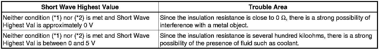 (a) The Data List item Short Wave Highest Val and insulation resistance have the relationship shown in the table below. Short Wave Highest Val decreases with a decrease in insulation resistance. However, in some cases, even though the insulation resistance of the vehicle is normal, Short Wave Highest Val may decrease. Therefore, check Short Wave Highest Val while considering the following.