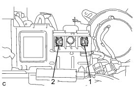 - After disconnecting the service plug grip, wait for at least 10 minutes before touching any of the high-voltage connectors or terminals. After waiting for 10 minutes, check the voltage at the terminals in the inspection point in the inverter with converter assembly. The voltage should be 0 V before beginning work.
