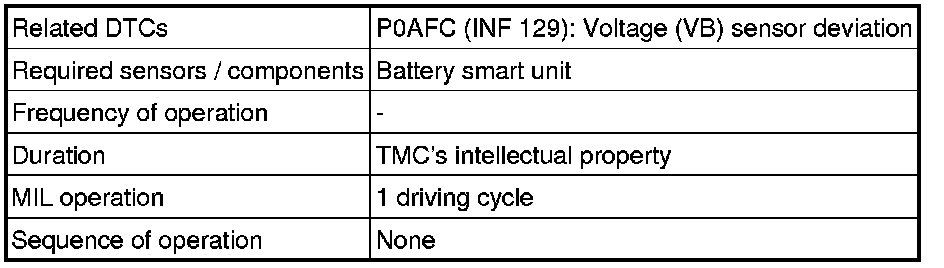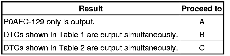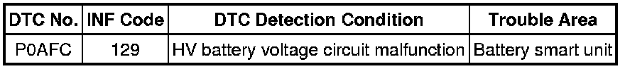 - P0AFC-129 may be output due to a malfunction which causes the DTCs in the table above to be output. In this case, first troubleshoot the output DTCs in the table above. Then, perform a reproduction test to check that no DTCs are output.