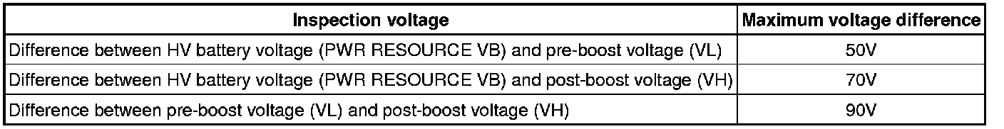 If, after performing troubleshooting, it is necessary to replace the battery smart unit, voltages need to be confirmed after installing the new battery smart unit. Confirm that battery voltages (PWR RESOURCE VB), pre-boost voltage (VL), and post-boost voltage (VH) in the Data List are 220V or more with the power switch on (READY), park (P) selected, and the engine stopped. When the system is normal, the PWR RESOURCE VB, VL, and VH values should be almost equal (voltage boosting will not occur when the shift lever is in neutral). If the difference between each voltage exceeds the values specified below, there is a malfunction in the battery smart unit.