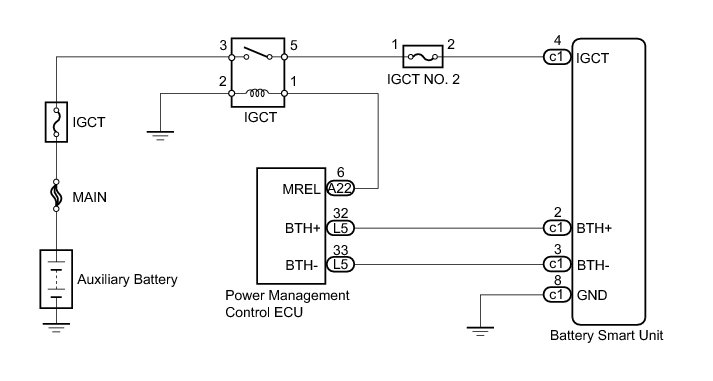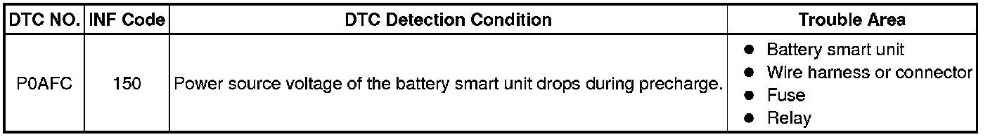 When the power management control ECU (HV CPU) detects a low power supply voltage for the battery smart unit while pre-charge is occurring, it determines that there is a malfunction in the battery smart unit circuit. When the power management control ECU (HV CPU) detects a malfunction, it will illuminate the MIL and set a DTC.